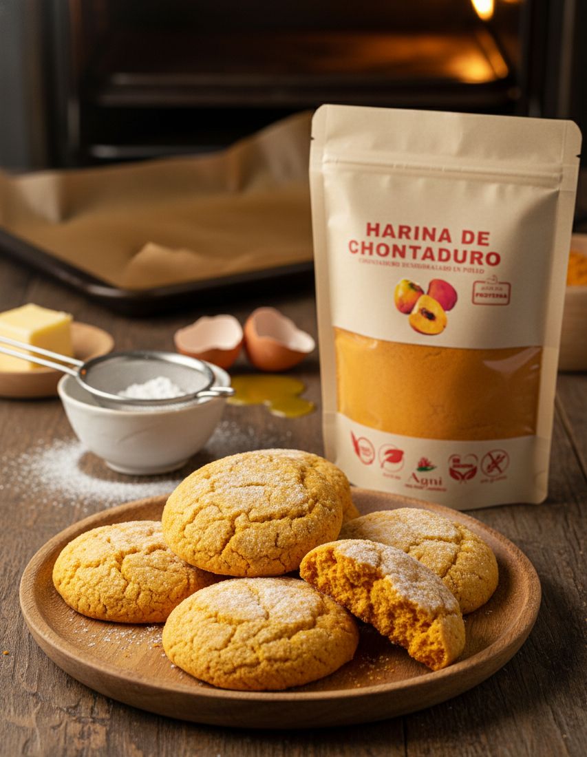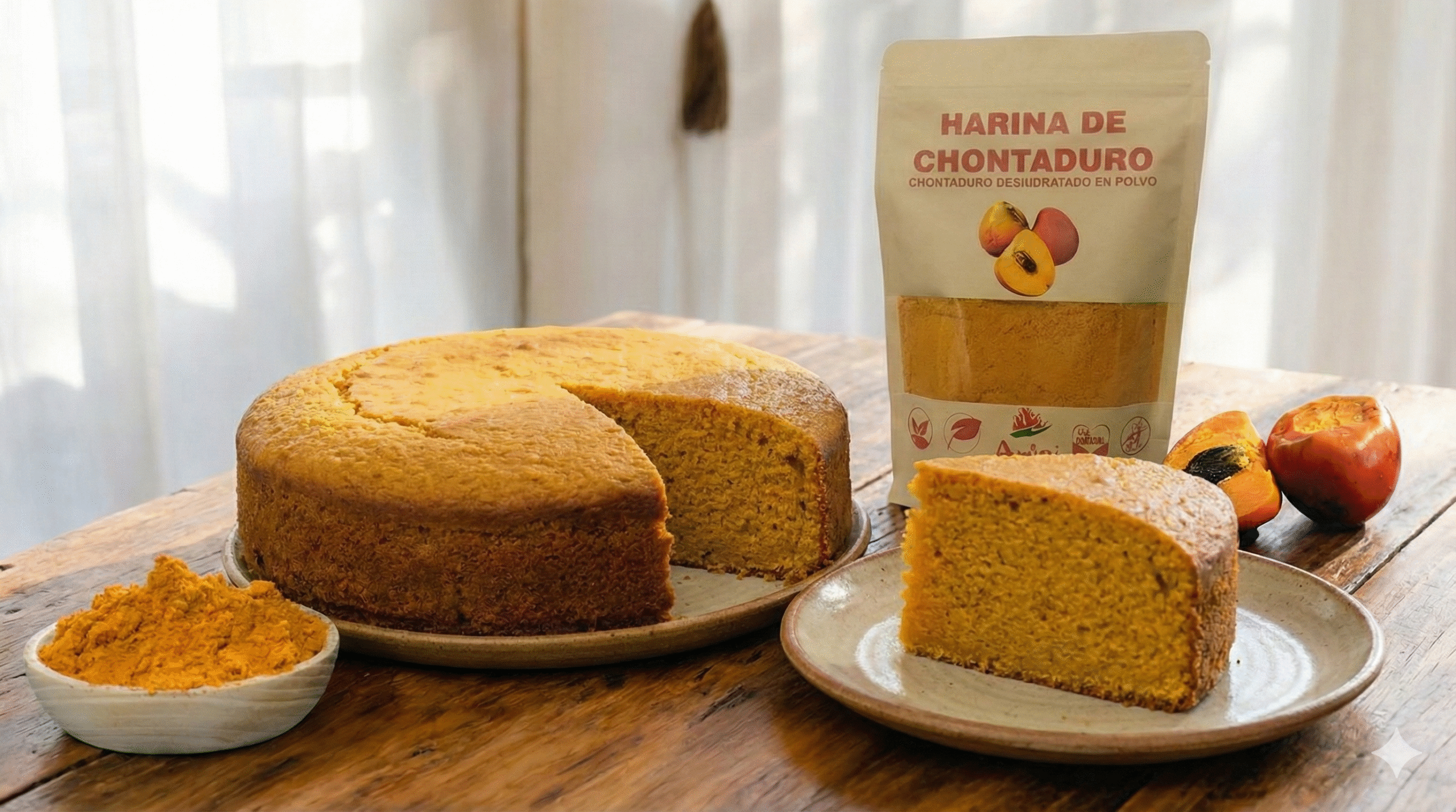 Mezclar la harina de chontaduro con la harina de trigo y el azúcar Adicionamos la levadura o polvo de hornear y mezclamos nuevamente, calentamos un poco la mantequilla para que se ablande, y la adicionamos a la mezcla luego vamos añadiendo los huevos de uno en uno sin dejar de remover, cuando tengamos una mezcla homogénea envasamos en bandeja cubierta con papel de hornear o engrasada previamente moldeamos con vaso, o cortador precalentar el horno a 200ºC hornear 15 minutos a 200ºC, apagar el horno y dejar 5 minutos más de reposo, sacar y dejar reposar al menos 1 hora antes de desmoldar y servir.