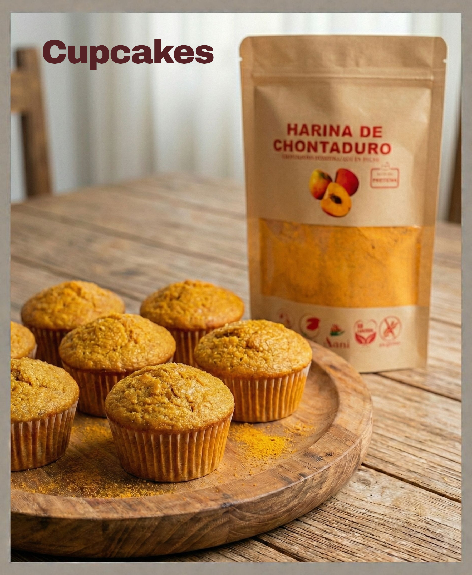 Preparación: Cernir los ingredientes secos menos la harina de chontaduro y mezclar, batir la mantequilla hasta homogenizar, agregar el azúcar y seguir batiendo, agregar los huevos uno a uno y batir hasta una completa homogenización. Adicionar poco a poco los ingredientes secos y la harina de chontaduro mezclar con una espátula o cuchara, hasta conseguir una mezcla uniforme. Precalentar el horno 15 minutos antes Envasar en moldes de cupcakes Hornear a180ºC 40 a 45 minutos Dejar enfriar 10 minutos aprox. y desmoldar