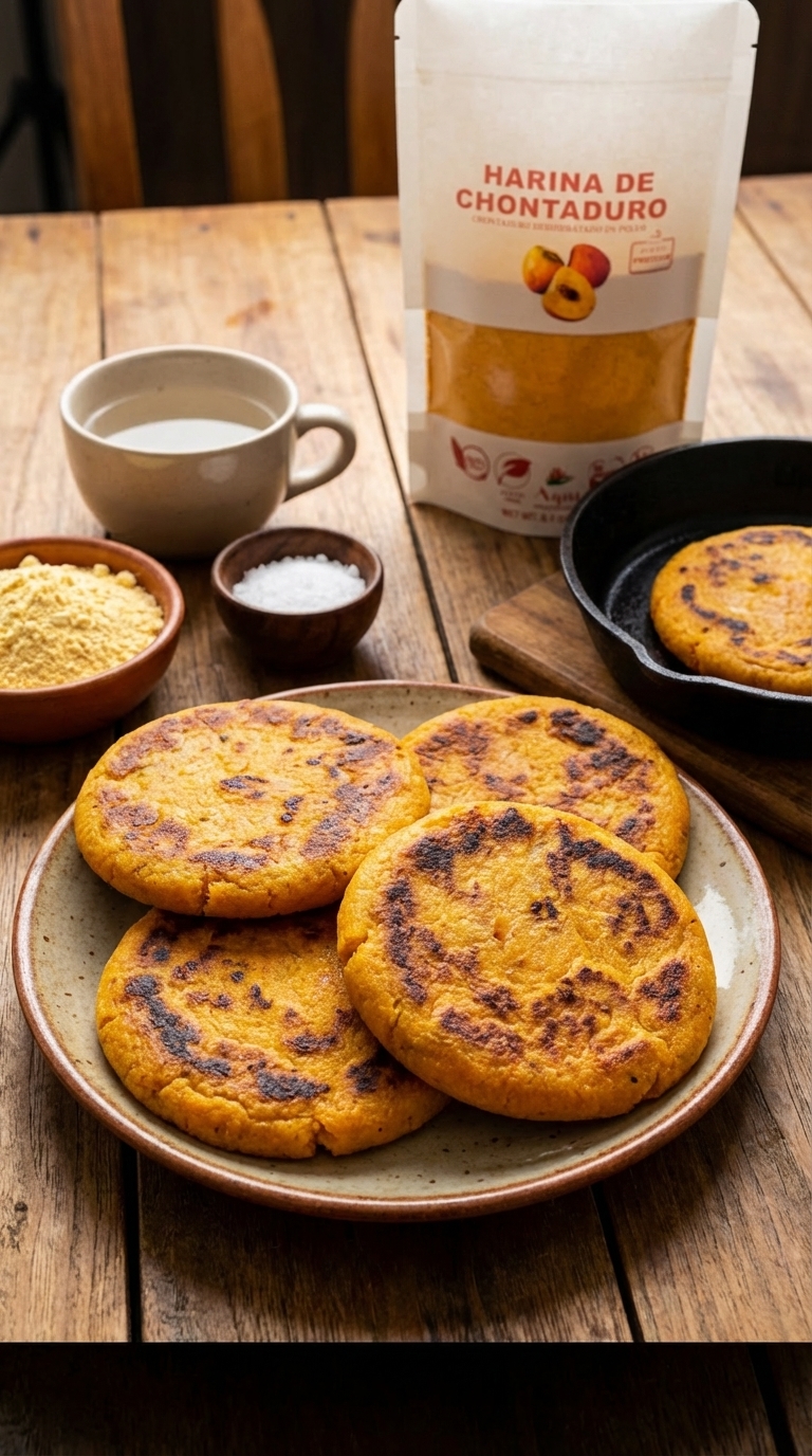 Preparación: En un tazón mezclar la harina de chontaduro la harina de maíz y la sal, mezclar todos los ingredientes hasta obtener una masa suave y homogénea. Formar cuatro bolitas del mismo tamaño, aplanar y redondear los bordes, poner en una plancha, azar y disfrutar