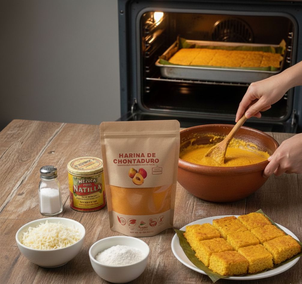2 Tazas de harina de chontaduro 2 tazas de harina de trigo 1 libra de queso criollo rallado 1 cucharadita de sal 1 taza de mezcla para natilla en polvo